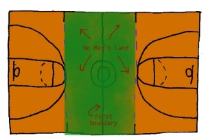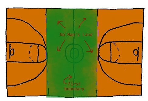 As the game progressed, the boundaries would become slimmer and slimmer. First, the court was divided into half equally at the “half court” line. Then, the boundaries would overlap as they were extended into the first line on each side of the court. I thought of this zone as “No Man’s Land.” No Man’s Land grew as the boundaries were extended to the other team’s free throw line. Finally, no lines would be declared.