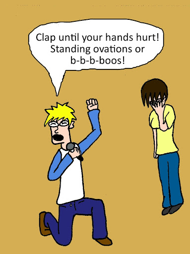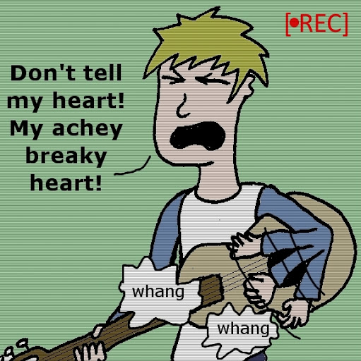 Ha ha! Your toons and tunes cracked me up in this one. I REALLY need to sleep, because I thought the last panel said “standing ovations or b-b-boobs!” Back in the day, us sophisticated types didn't call it a mullet, it was a bi-level haircut;)