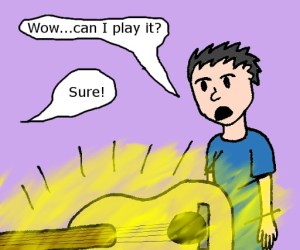 When the game fizzled out, I decided to show my cousin my prized possession. His eyes lit up when he saw my beautiful guitar. I was so proud my chest was practically bursting. He asked me if he could play it. That was when disaster struck.