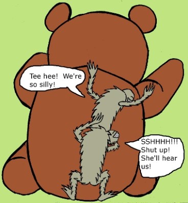 There’s a scene where the girl goes into her room, and a teddy bear that’s not supposed to be animatronic is moving and repeatedly saying, “I love you.” That would have been creepy…if they hadn’t gone through the pains of showing you the back side of the bear, where the creatures were standing on each other’s shoulders and physically moving the bear. It’s like they were afraid you’d think the monsters were supernatural, or had supernatural powers, so they MADE SURE they cleared that up by showing you Rugrats-esque hijinks.