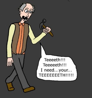 Once he has the woman’s teeth, he puts them in a little tray, with his own teeth, and sets them in a fireplace looking thingy, and begins talking to…something…about wanting his son back and that he brought the teeth as payment. The only reply is the echoey whispered response, “Child’s teeth.”