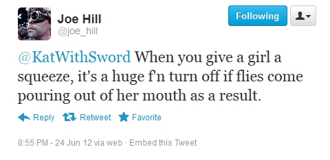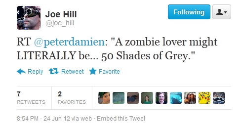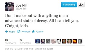 Last night on Twitter, Joe Hill, awesomely talented writer of novels and comic books, posted a series of tweets in which he was appalled by the idea of zombie sex.