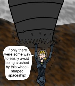 As the massive round alien spaceship falls to the surface, it starts to roll, and Shaw and Vickers find themselves directly in the path. Of the round…wheel-like spaceship. Apparently, running around on the surface of the planet too much must have fried their brains, however, because rather than running left or right out of the path of the gigantic spaceship, they try to outrun it, instead.