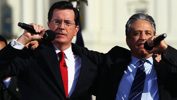Stephen Colbert, left, and Jon Stewart close the Rally To Restore Sanity And/Or Fear on the National Mall on Oct. 30, 2010, in Washington, DC.